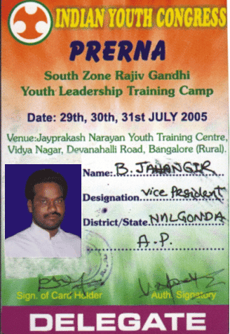 6. In the Year 2003, Jahangir attended a District Level Congress Political Training Camp which has been conducted and held at Nalgonda.