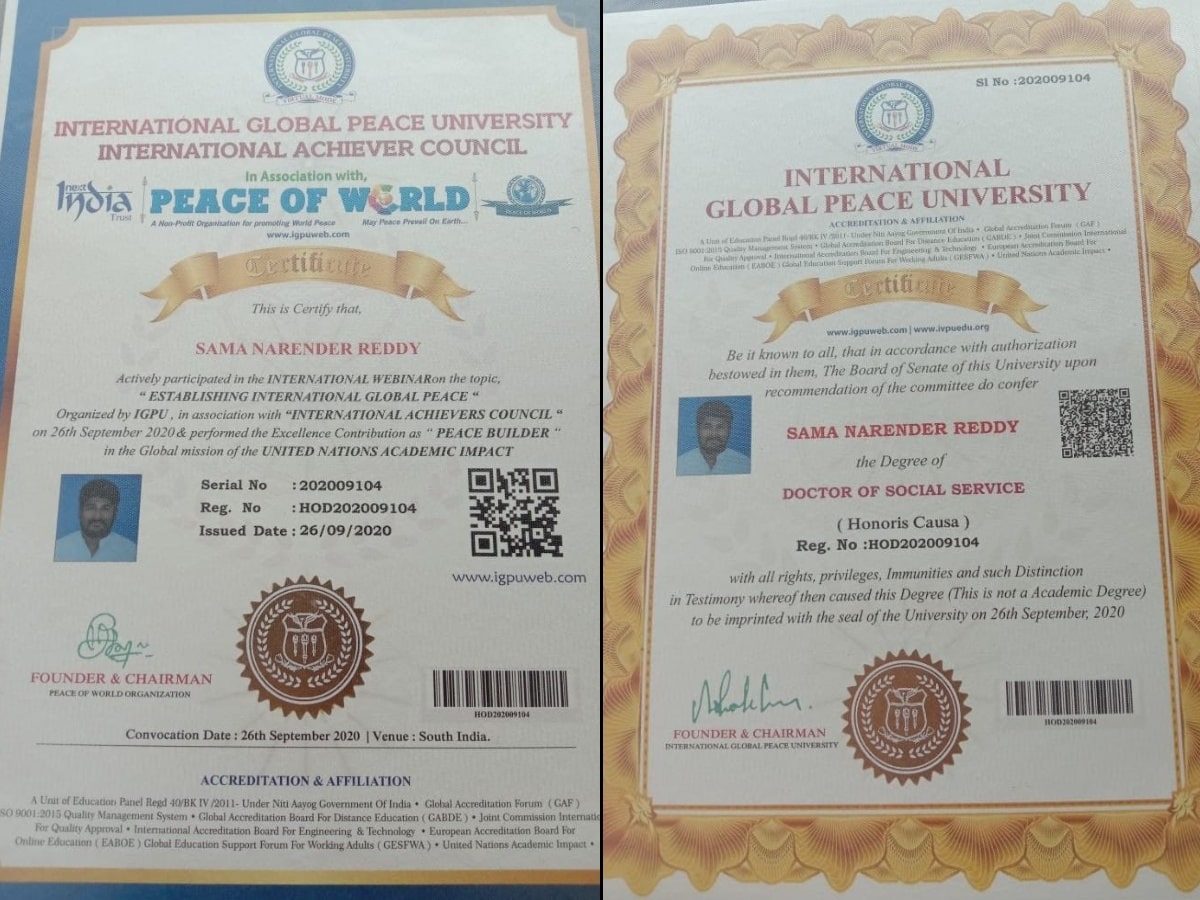 In 2020, He is the Doctor of Social Services from International Global Peace University. Narender Reddy was the Doctorate.