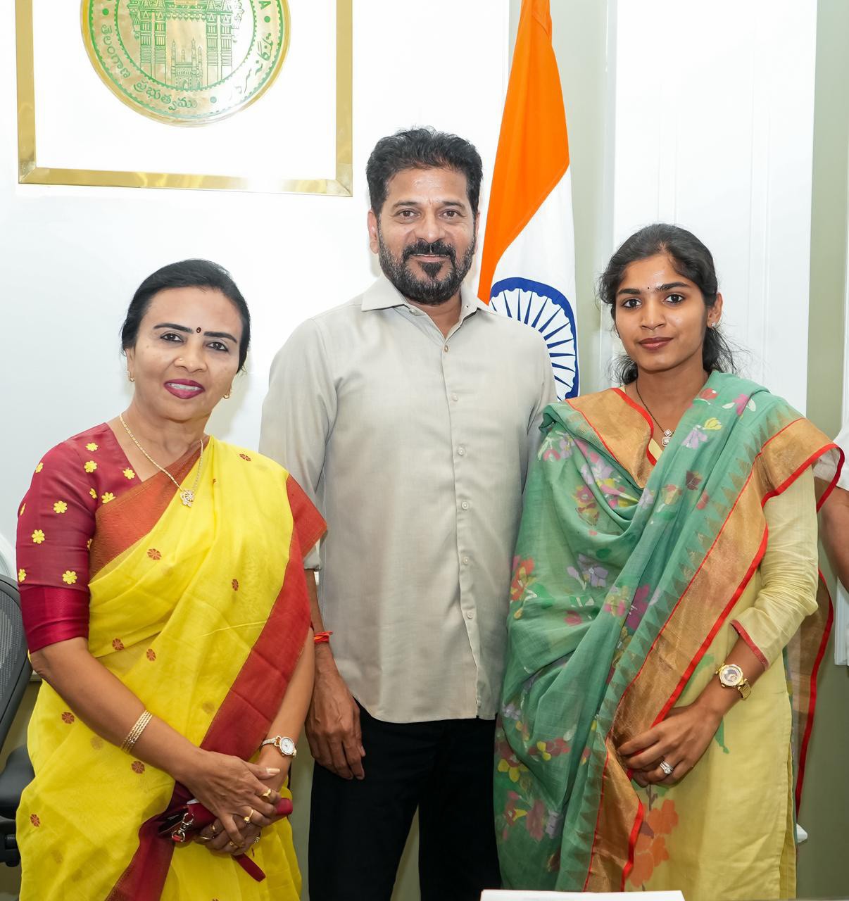 Palakurthi Constituency In-Charge Smt. Jhansi Dr. Rajender Reddy and Palakurthi MLA Smt. Yashaswini Reddy, accompanied by their family, paid a courtesy visit to the Chief Minister of Telangana State, Shri Anumala Revanth Reddy, at his residence.