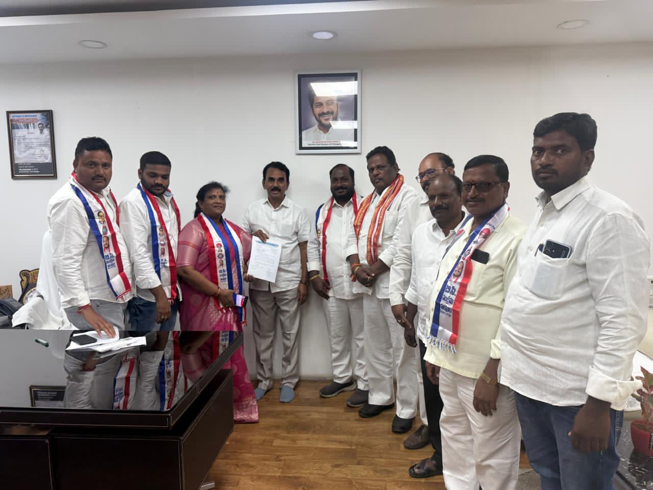 మంత్రి గారికి వినతిపత్రం అందిస్తున్న ఆర్. కృష్ణయ్య, కుందారం గణేష్ చారి, ఆచారి