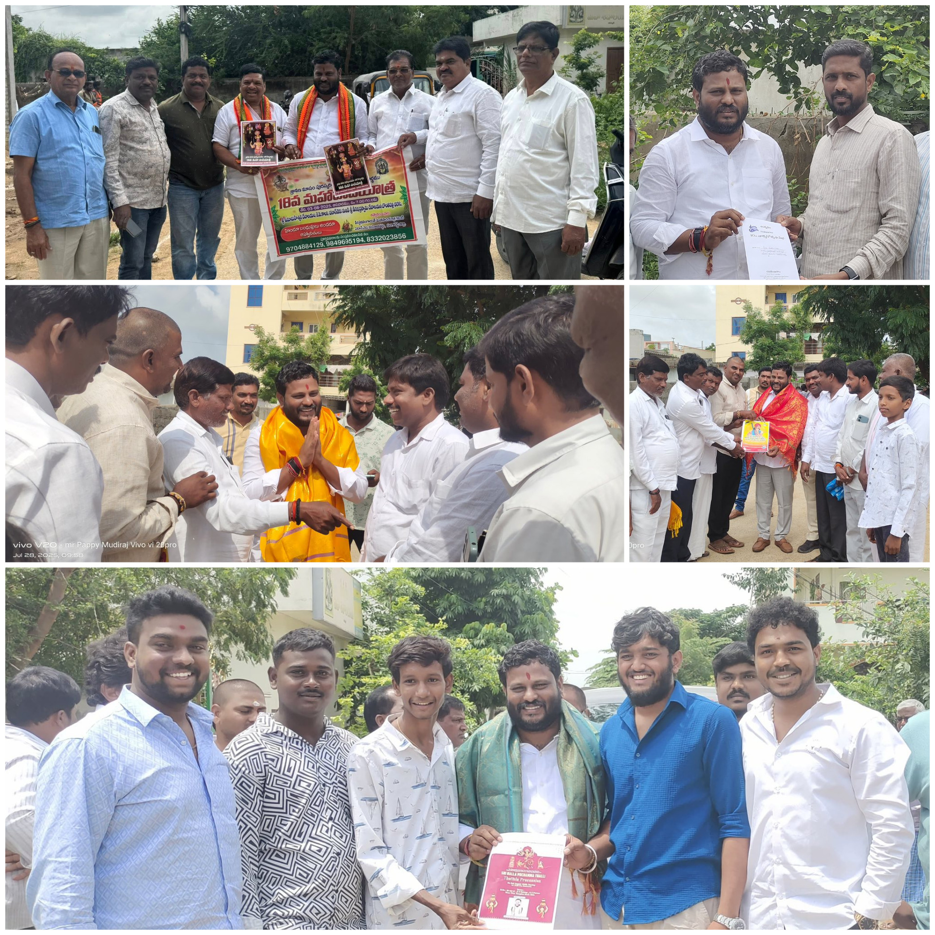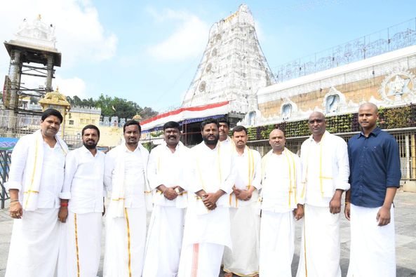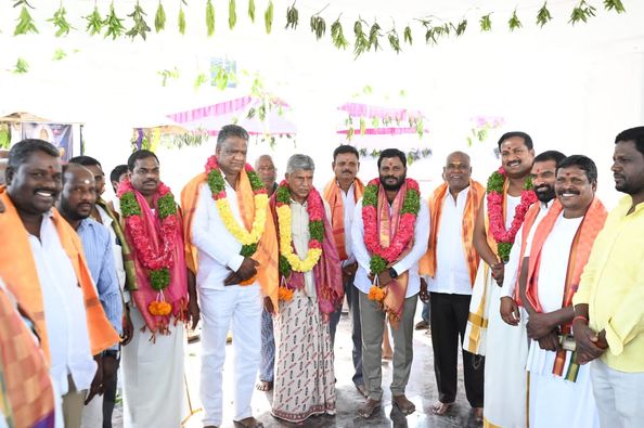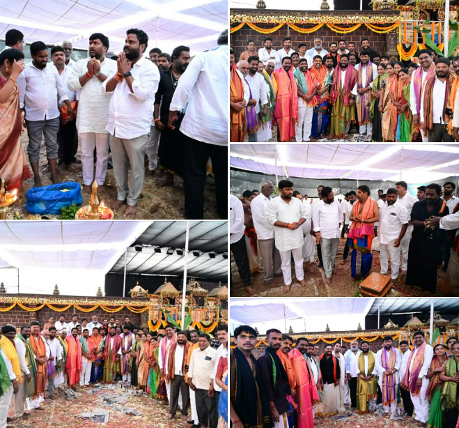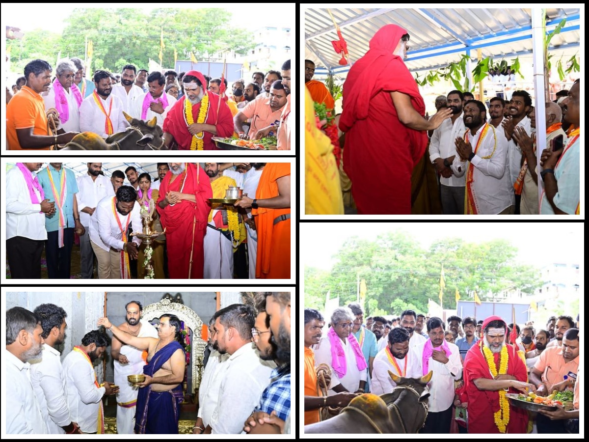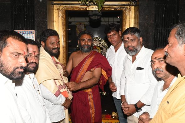 The BRS state leaders extended an invitation to Neelam Madhu Mudiraj by presenting the grand invitation mahotsava of Sri Venugopala Swami divya pratistapana, along with Sri Rukmini Satyabhama, in the temple.