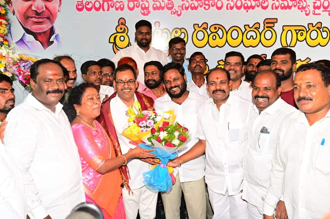 Neelam Madhu Mudiraj, in a polite and respectful manner, presented “Pittala Ravinder Mudiraj”, the Chairman of the Telangana State Federation of Fisheries and Co-operative Societies, with a beautifully arranged bouquet.